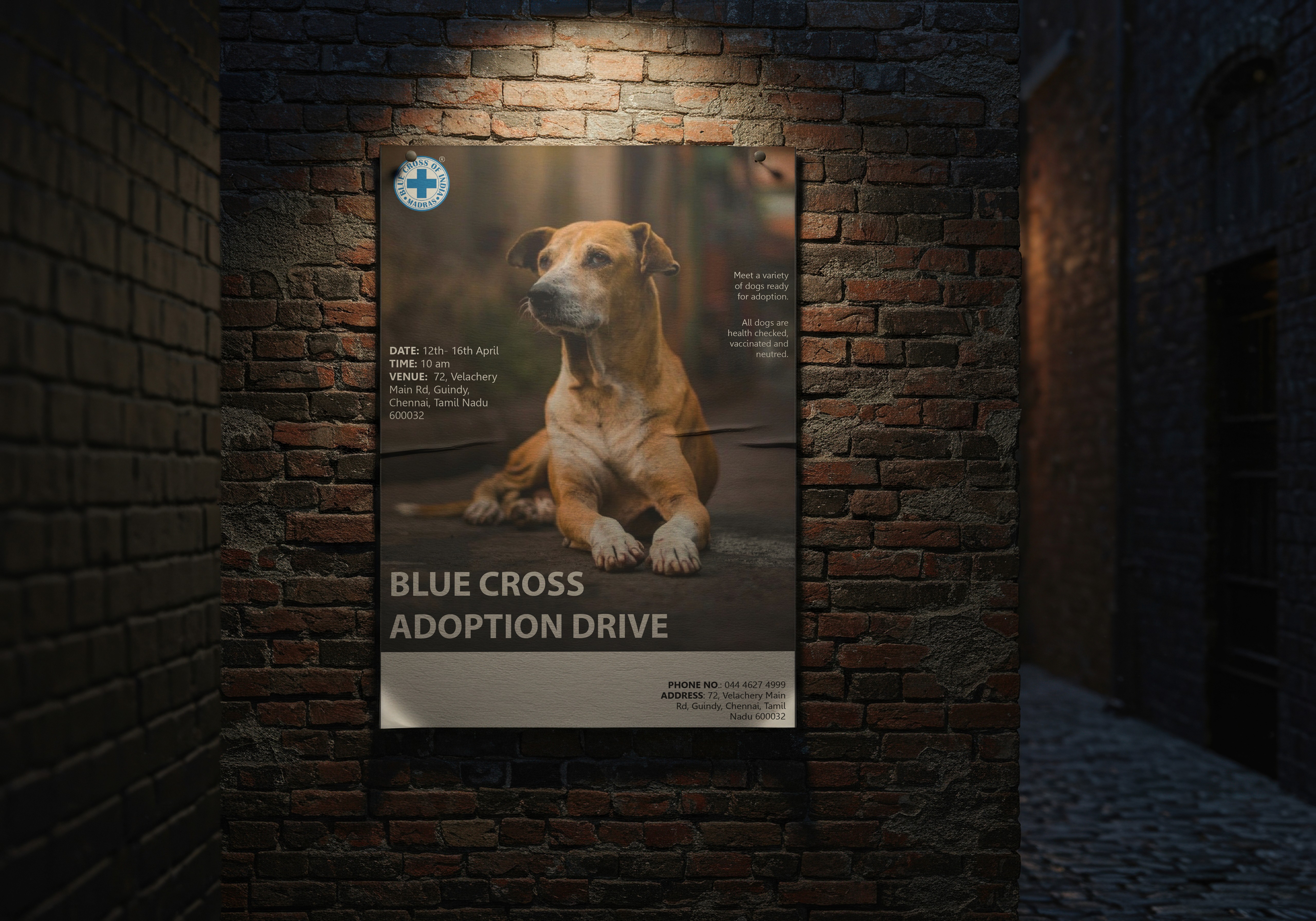 Brief: Design a flyer for an adoption drive organized by Blue Cross of India to find loving homes for Chennai’s street dogs.